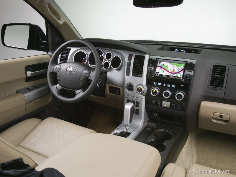 Комплектация «Секвои» - весьма богатая, а салон с традиционной кожаной отделкой выглядит дорого, элегантно и солидно. Кроме мультимедиа-системы с навигацией и камерой тыльного обзора, 10 подушек безопасности и трехзонного климат-контроля, салон буквально напичкан современным оборудованием и разными гаджетами. Даже в багажном отделении предусмотрена вентиляция, в потолке – телевизор, под сиденьями с электрорегулировкой – подогрев, а в аудиосистеме JBL – целых 14 динамиков! Недостатком является разве, что качество "торпедо", непонятно почему в таком дорогом и прстижном автомобиле Тойота применила обыкновенный черный пластик с серым вставками вместо виниловой обшивки.