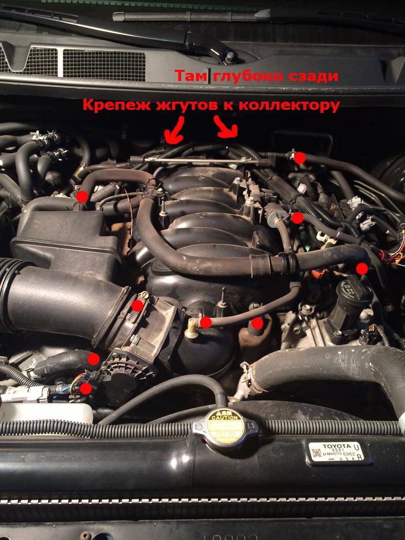Сначала нужно снять все патрубки и разъемы с впускного коллектора, я отметил основные такие места красными точками. Вам придется снять всего три электро разъема поэтому перепутать, что-либо сложно. Так же сложно перепутать трубки, они все разные и подходят к разным местам.