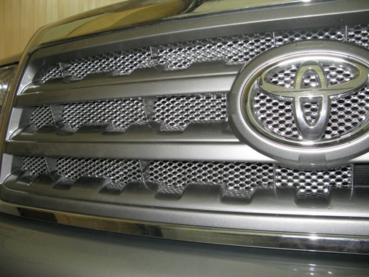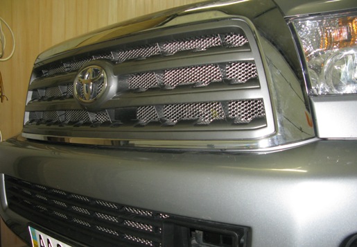 Wilson, ты прав: снимали бампер и решетку, для этих целей продается алюминиевая прямоугольная решетка, из нее вырезается необходимая конфигурация, притягивается черными хомутами к решетке, по краям загибается, формуется с помощью молоточка, и затем заливается полимером (на фото изнутри он черный по краю). Затем установка бампера и решетки на авто. Через сутки хомуты откусываешь (я их оставил, их не видно). Вот и вся технология.
