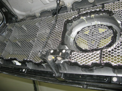В этом месте стоит штатный замок открывания капота со своей черной декоративной решеткой наружу, которую я не стал закрывать (вы ее увидели лишь потому, что фото сделано снизу). Будет время, может снаружи закрою ее этой же алюминиевой сеткой, для красоты.