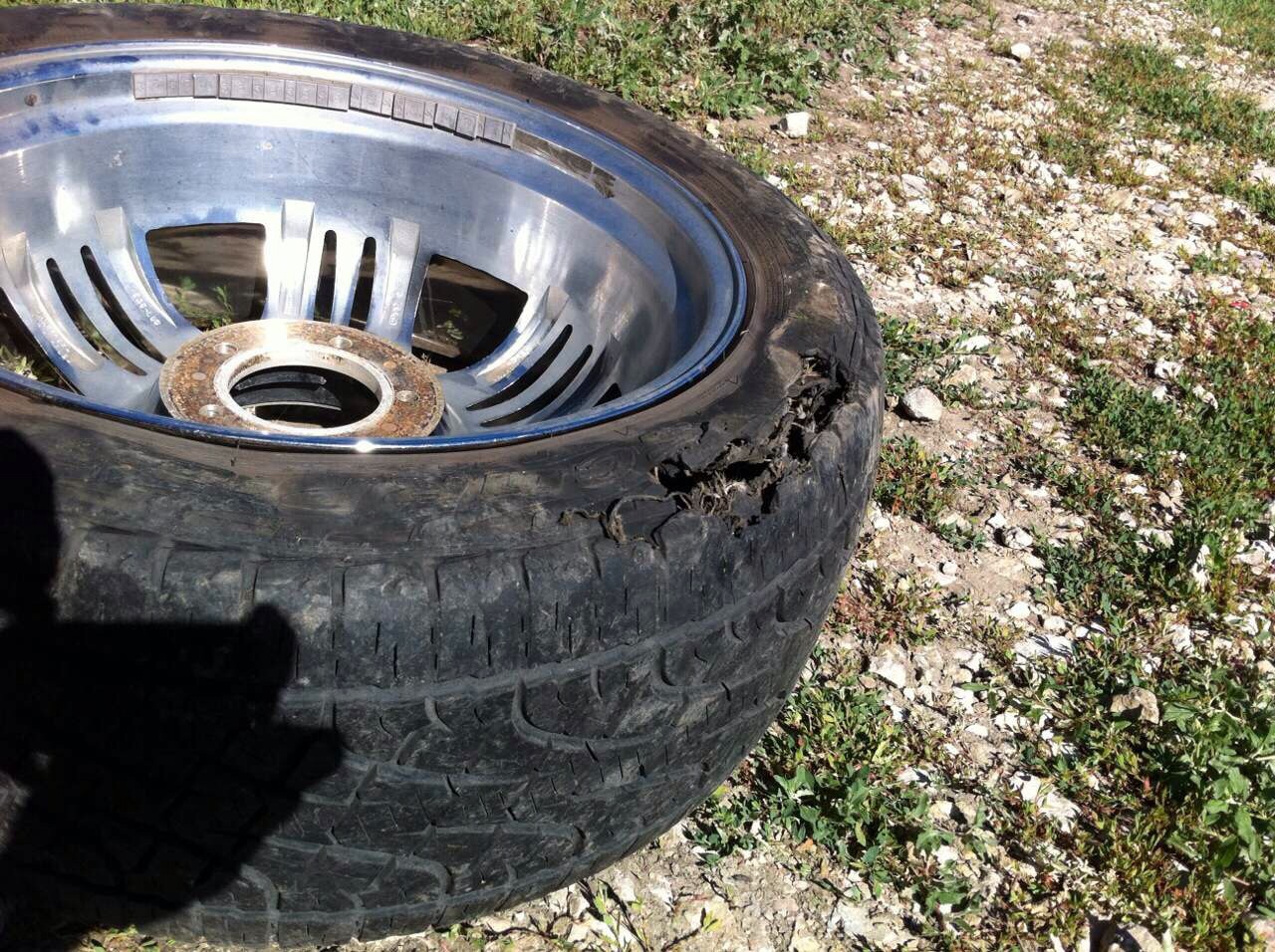 В итоге тормознул грузовик. Водила сильно сомневался, что его домкрат ко мне полезет под машину. Встал сзади под раму как родной. Поставил запаску, но она маленькая, 18-радиуса. А мне еще кататься и кататься. Пытался найти любую 22-ю резину - обзвонил Саратов и Волгоград (они по дороге) - нигде в НАЛИЧИИ 22-й нет... Пришлось возвращаться в сторону дома и брать покрышку в гараже (после проезда открытого люка сделанное колесо с небольшой грыжкой было в запасе).