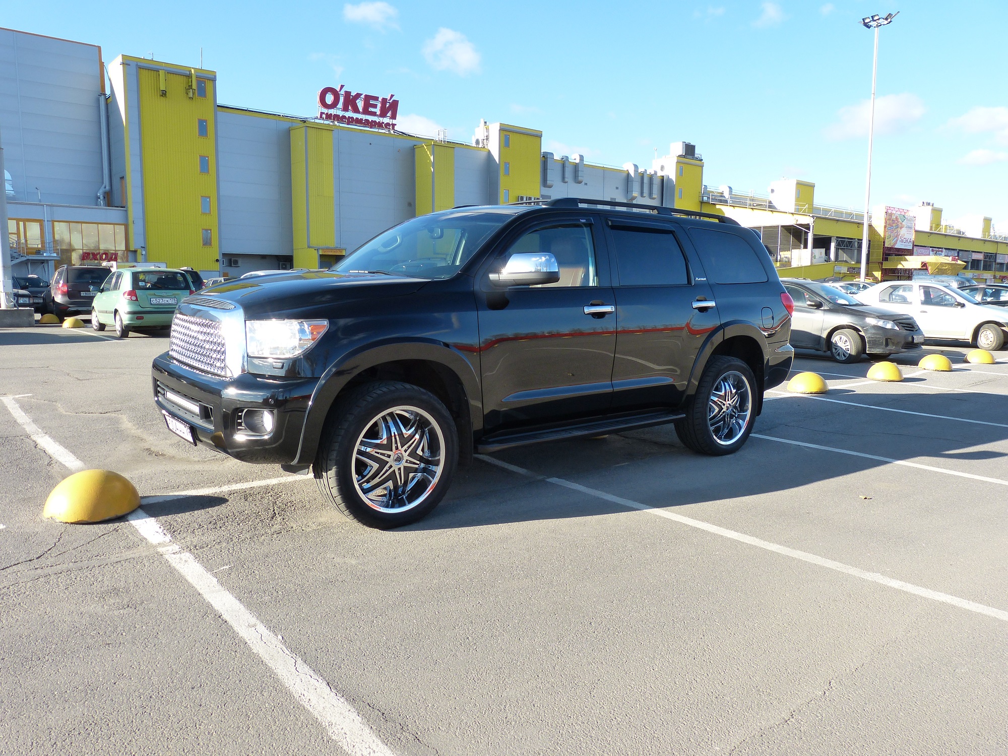По прожектору , по два крайних вроде бы против тумана не помню , в снег , дождь и туман пока не пробовал . Решётка полностью от тундры , для секвои такой нет , пришлось почти целый день дорабатывать , подтачивать , новые кронштейны из метала делать , усиливать . В общем самое лёгкое это купить а вот дальше сплошной геморрой , но это того стоит ведь такой нет ни у кого , ну во всяком случае в Питере точно . Сзади проставки не нужны , там переносится датчик уровня и машина сама стабилизируется , настройка занимает 10 минут времени .
