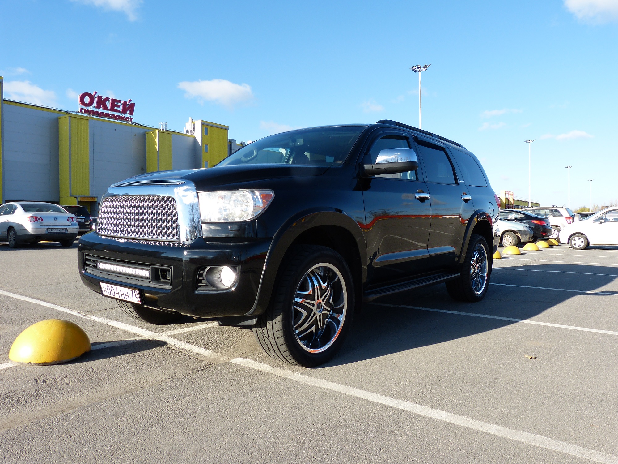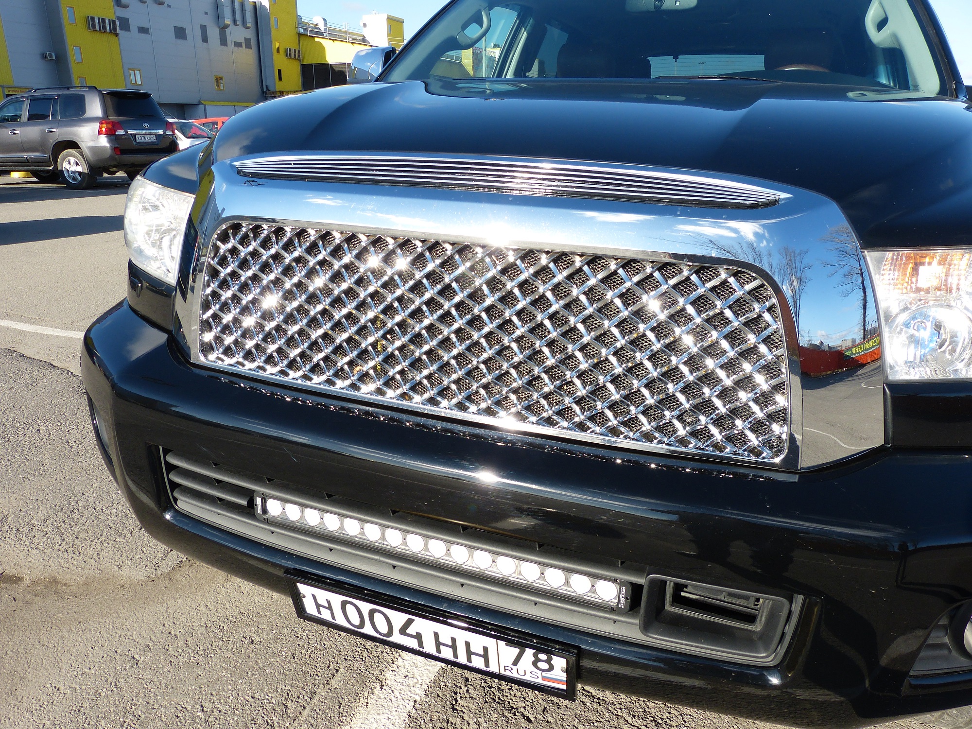По прожектору , по два крайних вроде бы против тумана не помню , в снег , дождь и туман пока не пробовал . Решётка полностью от тундры , для секвои такой нет , пришлось почти целый день дорабатывать , подтачивать , новые кронштейны из метала делать , усиливать . В общем самое лёгкое это купить а вот дальше сплошной геморрой , но это того стоит ведь такой нет ни у кого , ну во всяком случае в Питере точно . Сзади проставки не нужны , там переносится датчик уровня и машина сама стабилизируется , настройка занимает 10 минут времени .