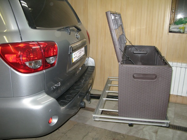 Подхват установлен, "сундук" то же (117*44*H58 cm, водонепроницаемый, пластик, пр-во Израиль, имеет двойное назначение: на улице в саду для разных вещей и у меня на багажнике), смотрите. Я совместил возможность использования чистого багажника (каркаса алюминиевого) или бокса на 265 л. На фото видно, что зазор между "сундуком" и задней дверью при открывании достаточный - это одна из причин, по которой я не стал удлинять дышло, вторая - это разница в нагрузках и длине на плечах (одно - 14 см, другое - 86 см с возможной нагрузкой в 200 кг, а при "прыжках" авто и то больше). Посмотрел, показал вам, и поставил в гараже до момента "Х".