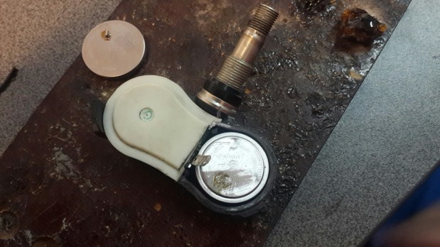 В сервисе в течении 10 мин определили какой именно датчик не подает сигнал. Дальше шиномонтаж, демонтаж датчика. Он у меня в руках: визуальных повреждений нет, когда болтаешь его, слышны удары чего то не закрепленного - сразу приходит мысль: оторвалась батарейка от контактов.