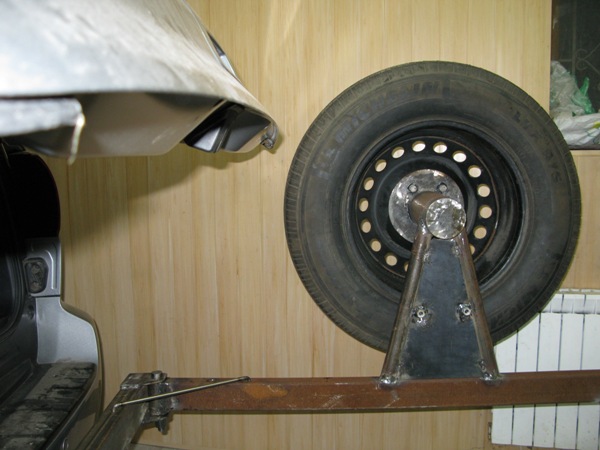 Если стойка с колесом будет ближе к петле, то придется значительно увеличивать поперечину (почти до конца бампера), иначе дверь багажника не откроется.