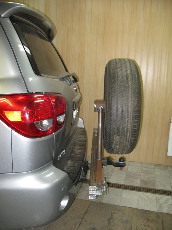 Последний вариант крепления запаски обкатал, доволен, о том, что весит запаска, вспоминаю, когда вижу в зеркало заднего вида верхушку номерного знака и все-е. Если хочу на нее посмотреть при остановке, не выходя из машины - включаю заднюю передачу и вижу ее на мониторе через камеру.