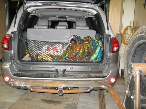 Если стойка с колесом будет ближе к петле, то придется значительно увеличивать поперечину (почти до конца бампера), иначе дверь багажника не откроется.