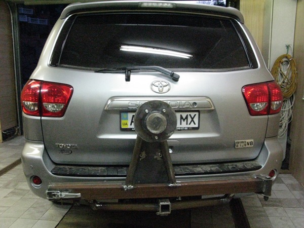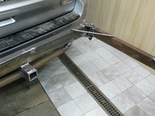 Если стойка с колесом будет ближе к петле, то придется значительно увеличивать поперечину (почти до конца бампера), иначе дверь багажника не откроется.