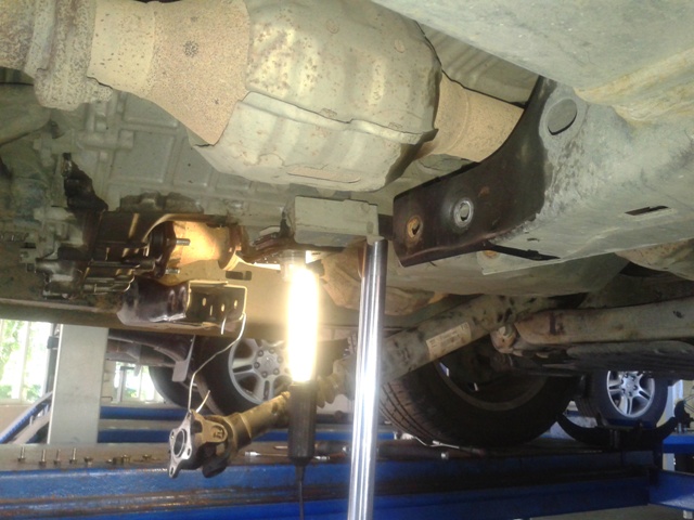 Вчера под задним мостом увидел масляное пятно диаметром 100 мм, на подъемнике обнаружили, что течь идет из под переднего сальника раздаточной коробки на передний кардан, а по средней защите относило на защиту заднего дифференциала и там капало. Вообщем, замена: 4 часа + 50 долл. Ничего сложного, только пришлось дополнительно снимать поддержку поперечную (она на фото, из-за нее не могли опустить вниз кардан, который мешал снять ступицу с раздатки). Пробег 145 тыс. км.