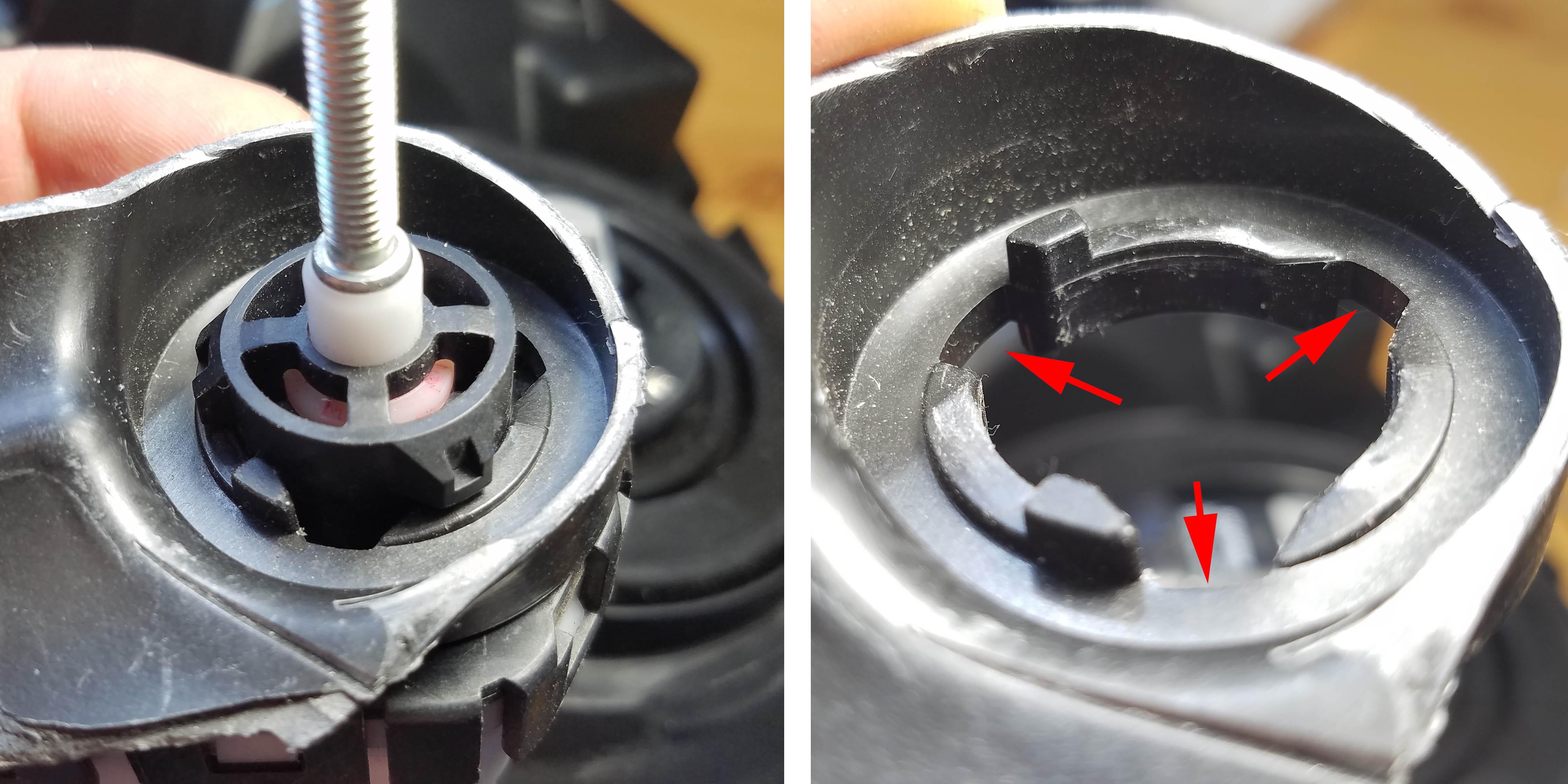 Так же существует и более радикальный способ (это когда внутри фары нет трёхзубой отливки). На пример этот способ можно применять для LEDфар которые пошли на Йолку после 2018г . В таком случае моторчики и фары полностью разбираются и (в дальнейшем несъёмным способом) соединяются на винты м3.