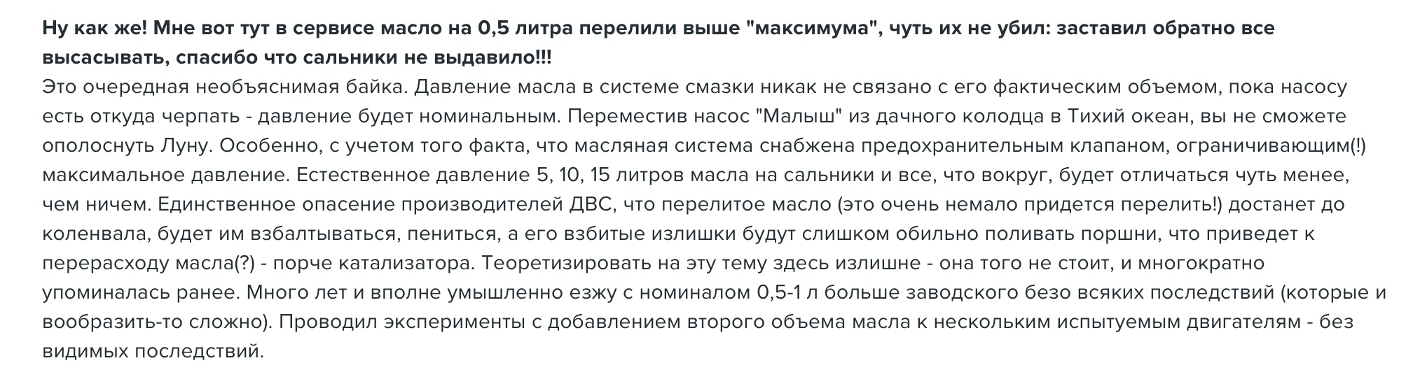 Саша, можно один не скромный вопрос.Stark писал(а): ↑16 июл 2019 19:22Уровень масла в двигателе не меряют на работающем двигатели. Как думаешь, тот водитель который на тундре проехал миллион миль, тоже лил больше масла на литр? Если он лил согласно руководству по эксплуатации и проехал 1600000 км то зачем по своему усмотрению лить больше на литр? Чтобы проехать два миллиона миль? Возможно вред от перелива сразу не наступит, а проявится через несколько десятков тысяч миль, что тогда?