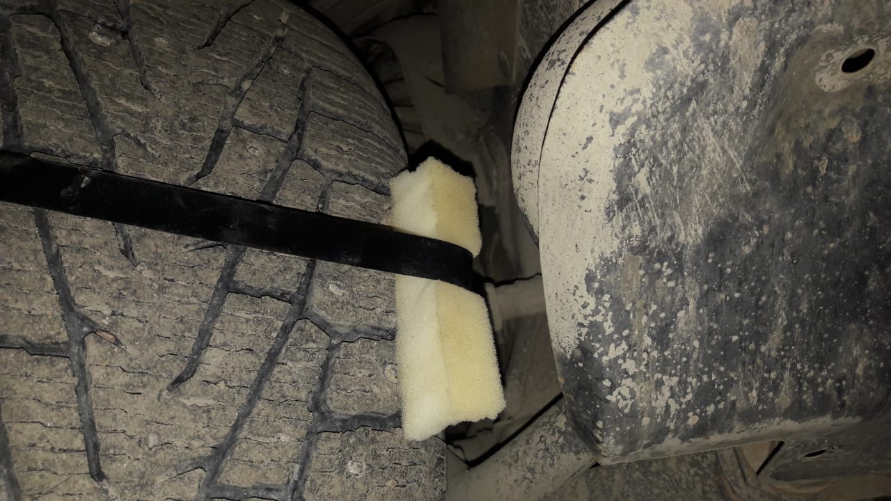Одним словом, вся эта неопределенность побудила меня произвести некий эксперимент, пока моя машинка находилась в сервисе у ребят по оклейке бронь-пленкой кузова и бамперов, я использовал ненужный поролон, который нашел в ненужных обрезках у парней в сервисе. Итак, я нарезал его небольшими кусками размерами 3см х3см х 8см примерно. Далее нехитро прикрепил к переднему колесу в сборе с зимней шиной в стандартном размере эти кусочки поролона изолентой.