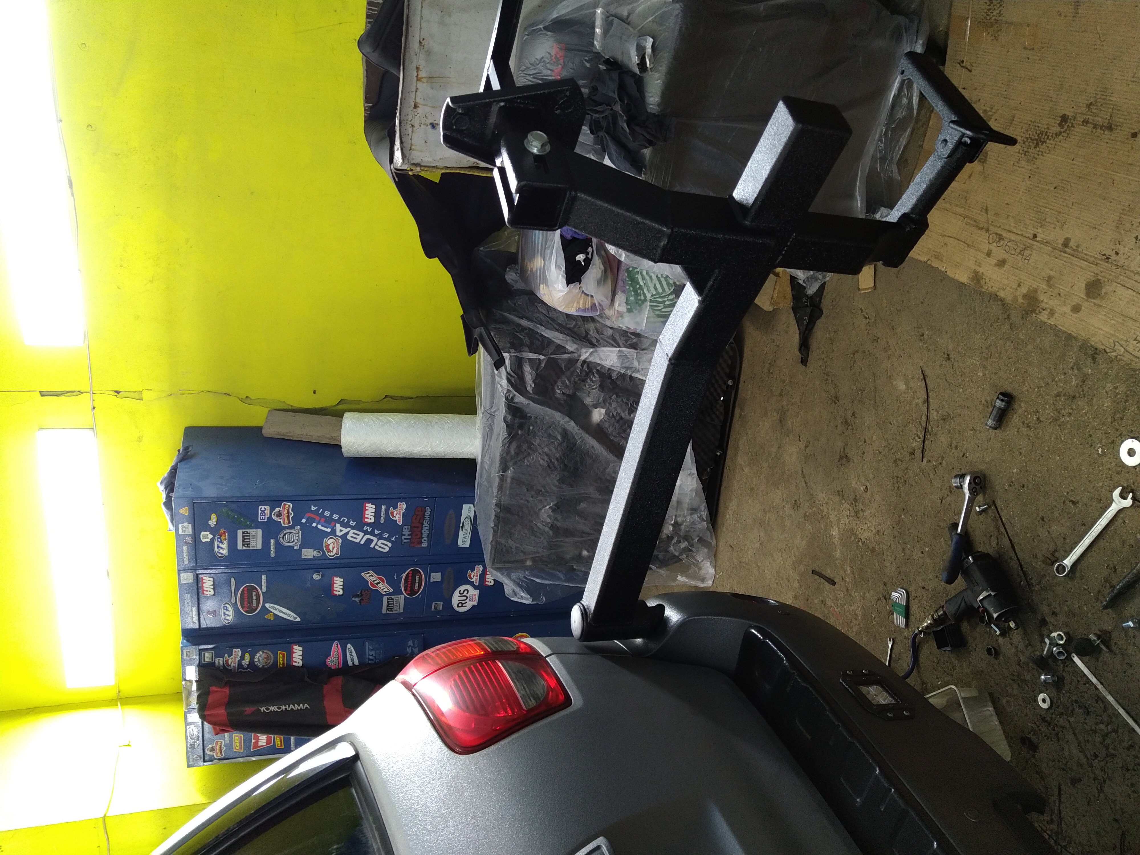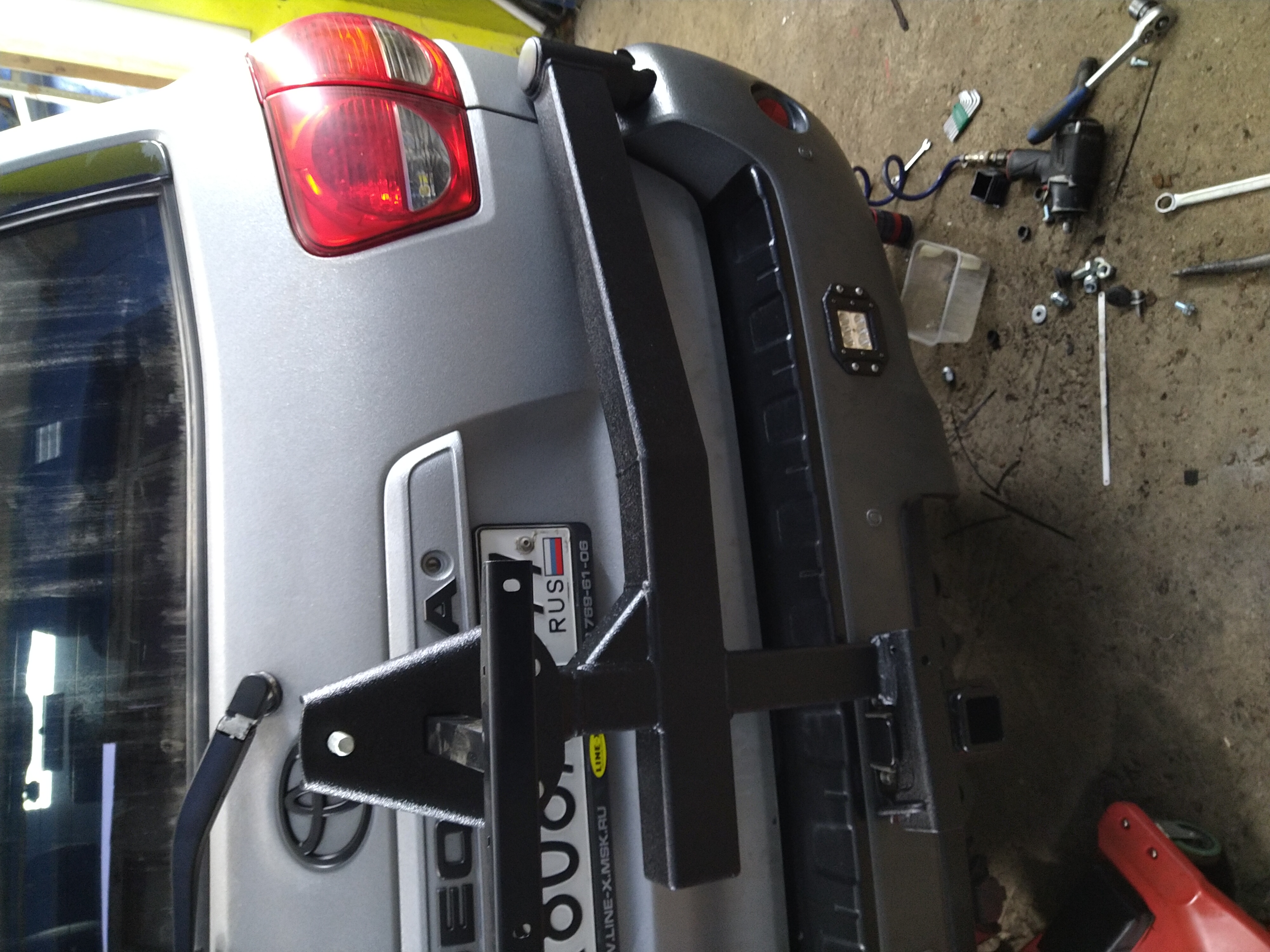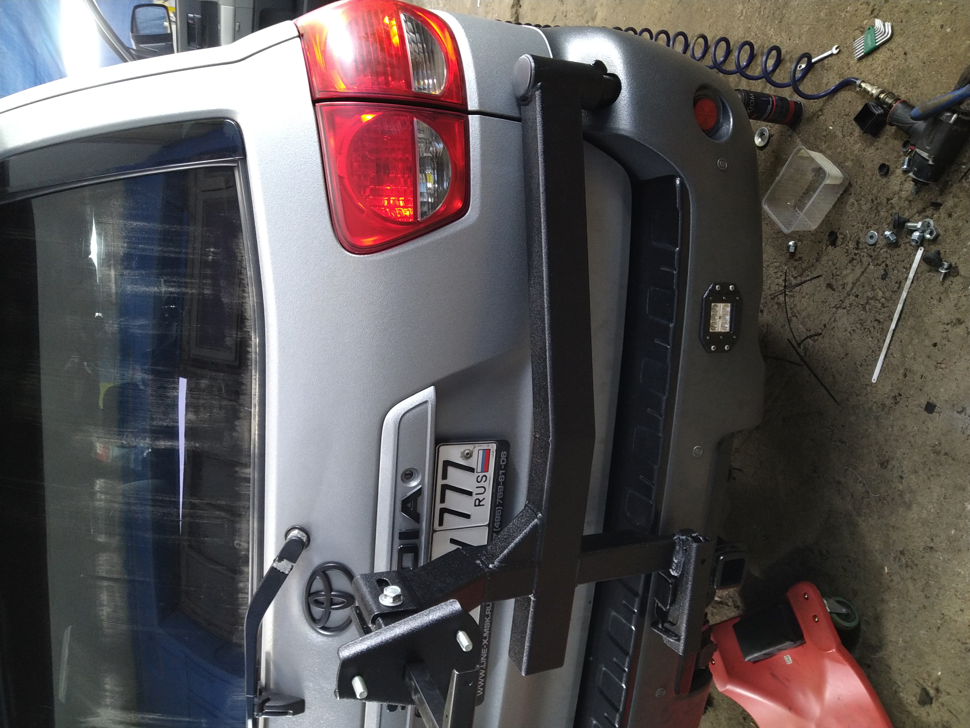 Ведь можно заморочиться и сделать поворотную калитку, чтобы колесо снимать стоя на земле, не залезая в багажник.