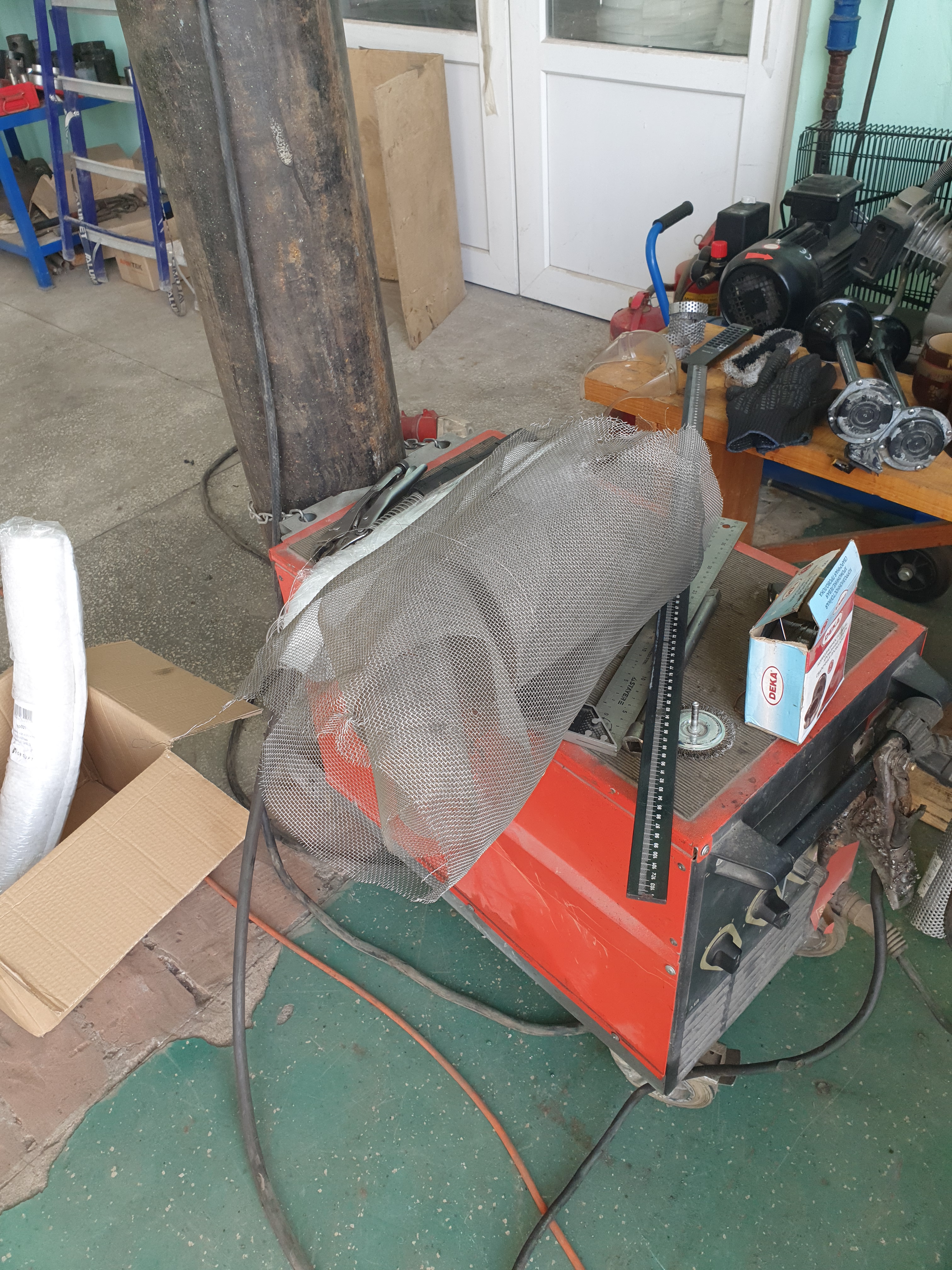 Продолжение работ: вырезали и выкинули потроха из глушителя Edex, внутри корпуса из перфорированной трубы сварили Y-образное соединение (с переходом на больший диаметр). Y-образную часть как самое нагруженное по давлению место обмотали двумя слоями нерж. сетки, всю остальную перфорацию в один слой.