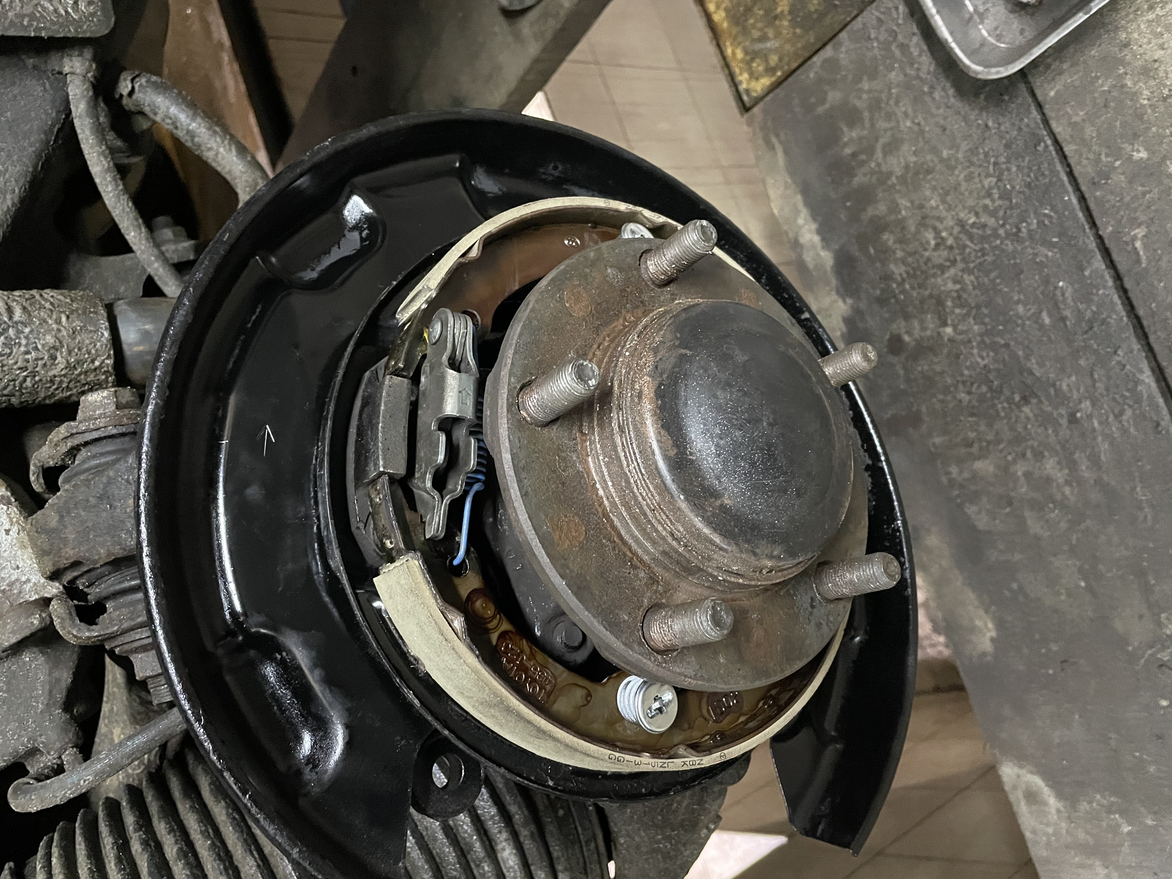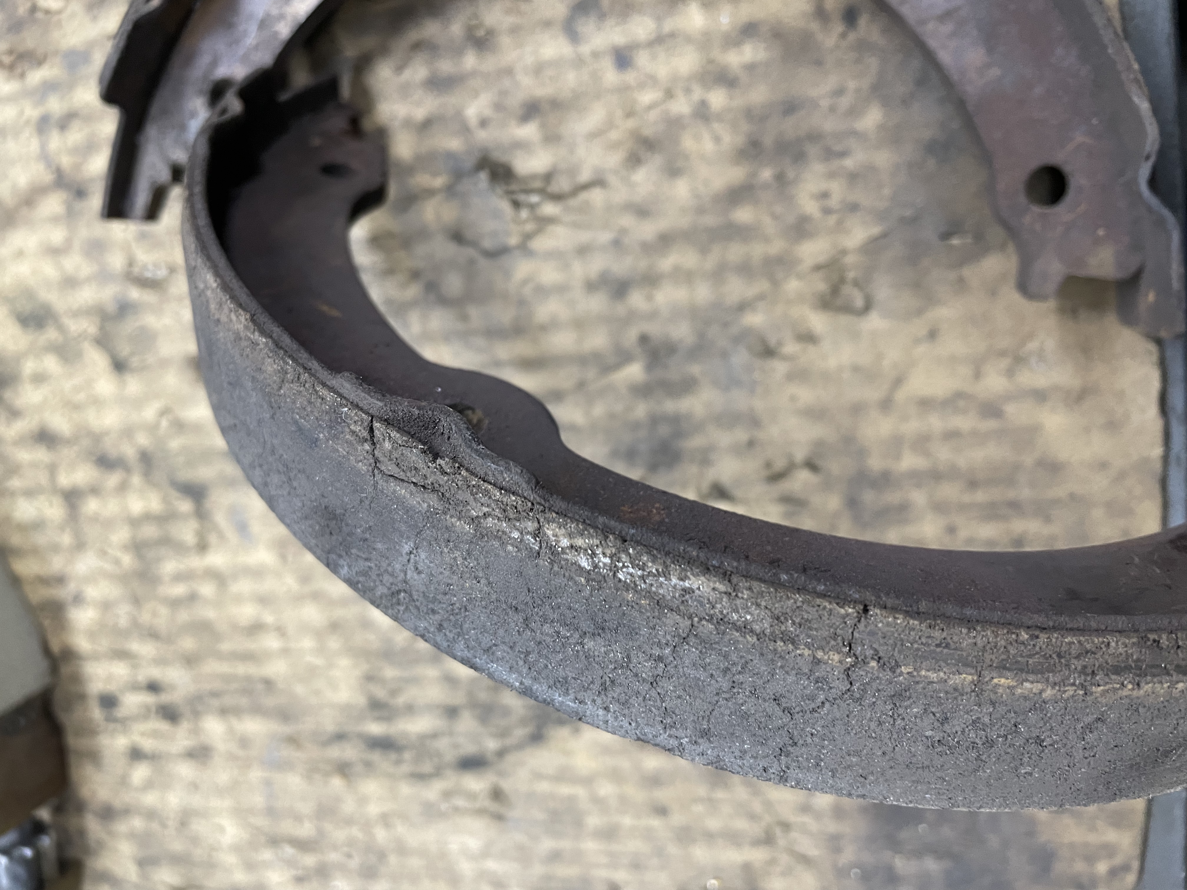 Пришло время менять задние тормозные диски и я заглянул внутрь барабанов. Тормозные колодки ручника оказались изношены и подлежали замене.