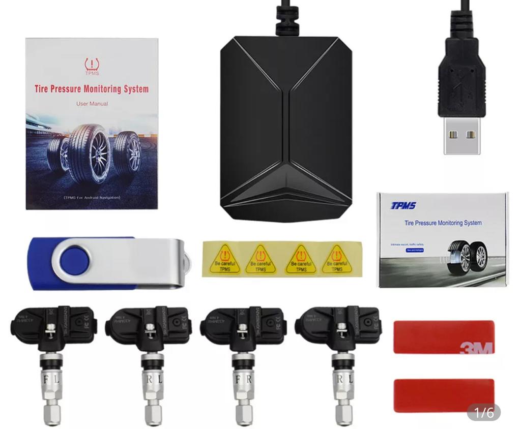 Одновременно приобретена система USB Android TPMS с новыми датчиками давления шин. Дело в том, что имеющиеся штатные датчики давно устарели, и мягко говоря малоинформативны. Используя их мы видим лишь только сигн. лампочку на щитке, при этом не пойми какое колесо спускает, не говоря уже об индикации уровней давления. Работу новых датчиков можно будет наблюдать на Android мониторе ГУ, для чего на Плей Маркете, скачано соотв. приложение. Все примерно как на фото. Видны не только давление но и температура на дисках. Настройки позволяют установить и отслеживать нужные уровни показателей, а о критических изменениях, система просигнализирует не только на экране но и звуком.