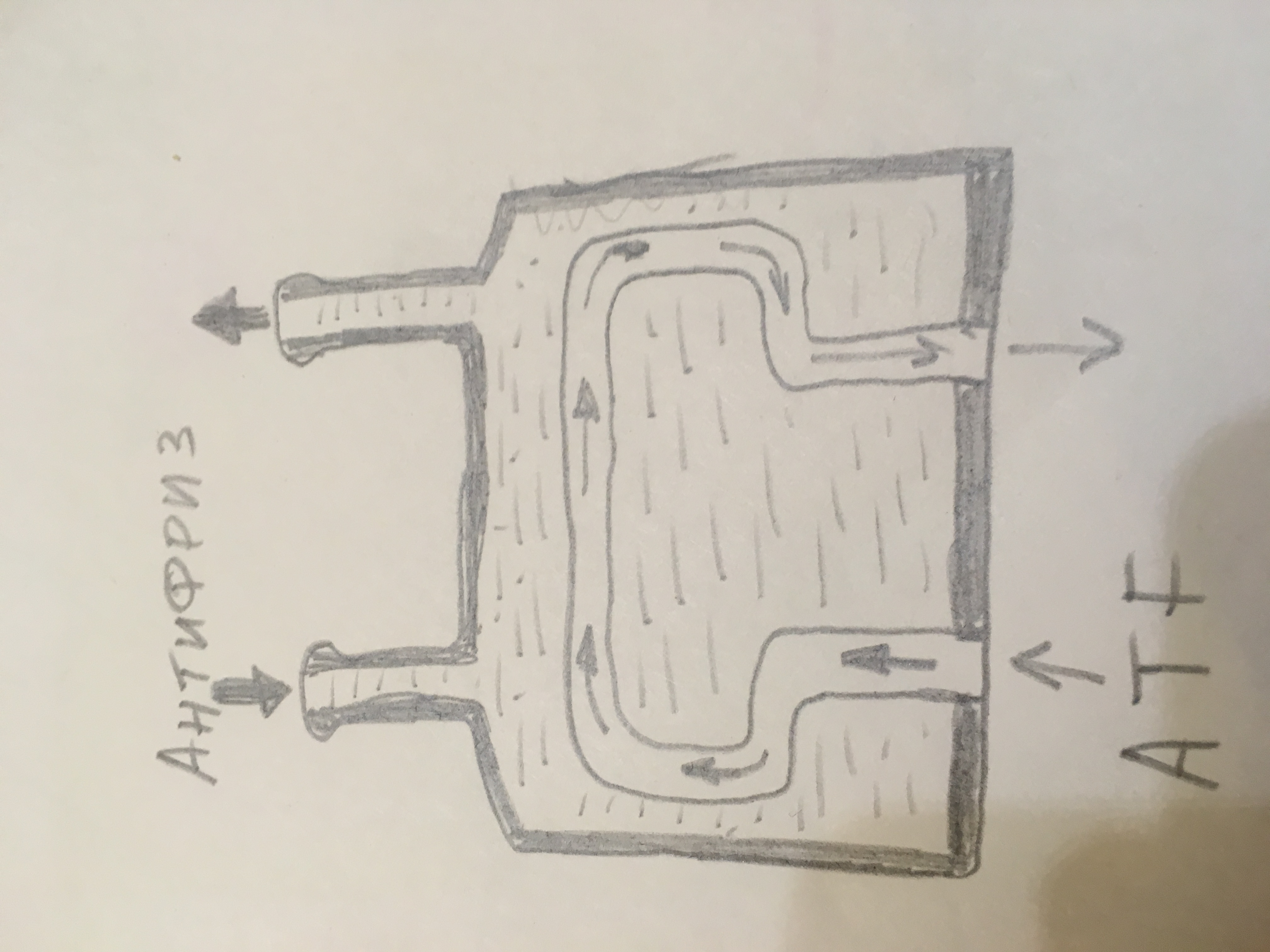 Вот простейшая схема теплообменника. В реале там конечно все круче (соты и т.д). ATF и антифриз живут в одном устройстве но при этом не сообщаются.