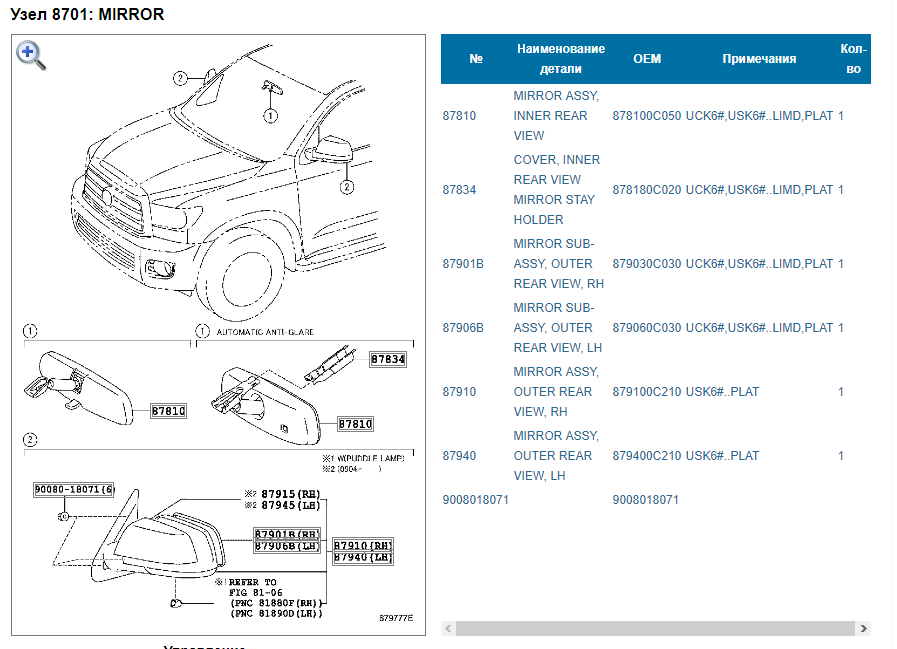 Винкод на экзисте кажет такое: Исходя из тойотовского даташита часть парт номера хром накладки пассажирского зеркала = 87915