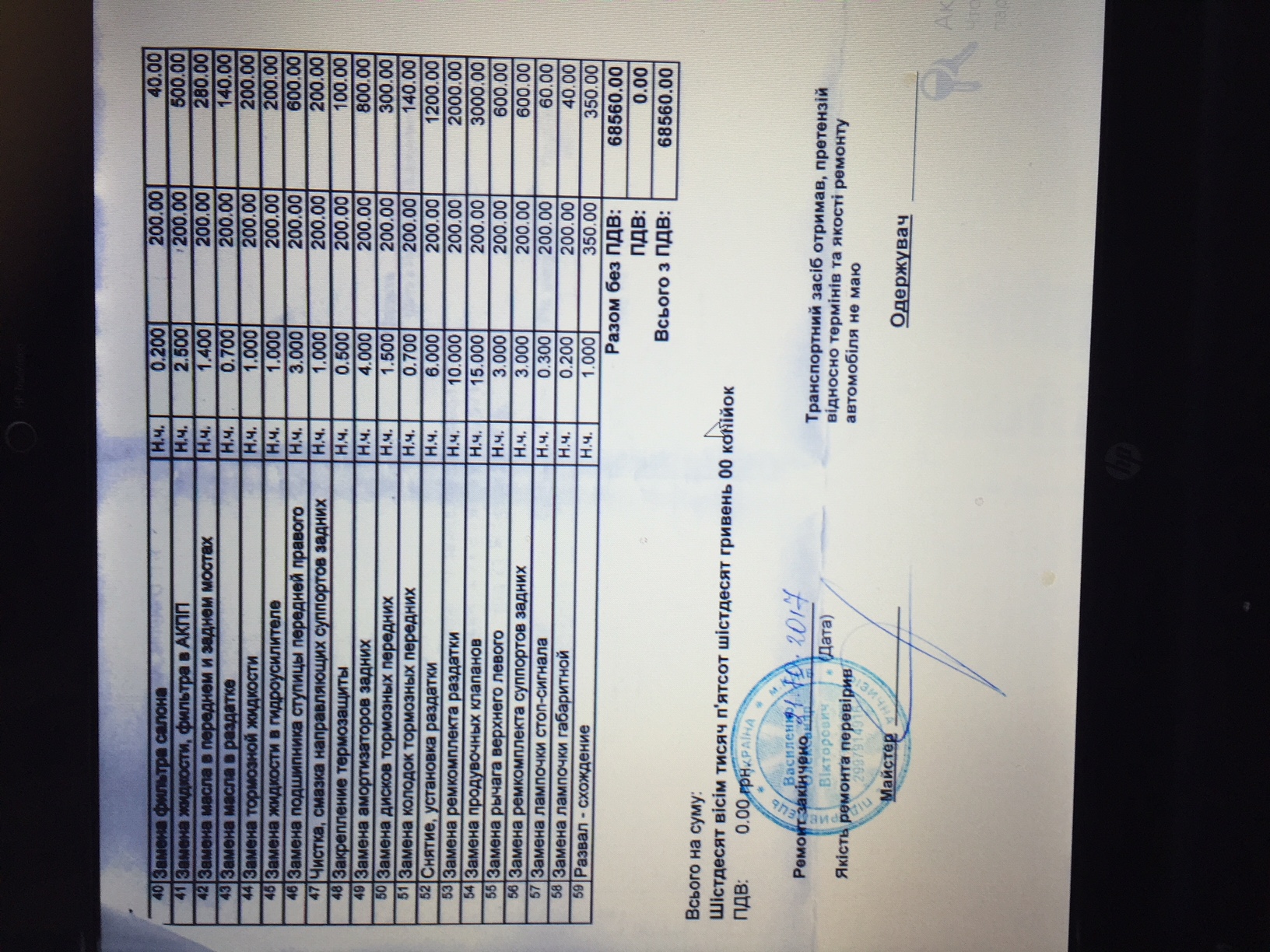 Перед покупкой ты ее смотрел? С каким она гос № бегала, она была киевская, какой пробег, сервису сегодняшнему доверяешь?Kit писал(а):Привет всем!Сделали ТО на моей "МАЛЫШКЕ" после приобретения.Перечень работ и цены смотрите на фото.