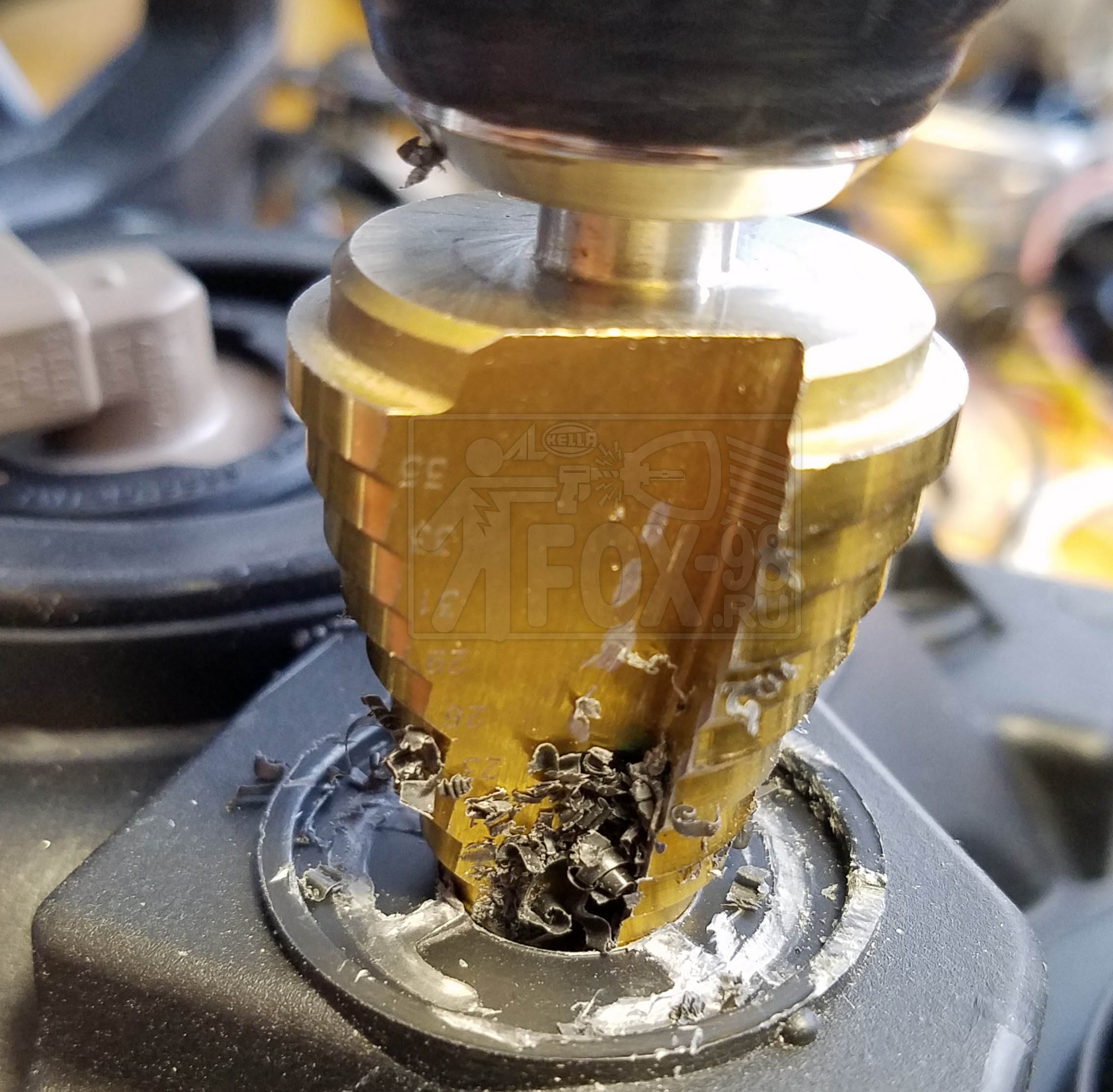 2. Удаляется винт регулировки. 3. Рассверливается отверстие до диаметра 21мм 4. Скругляются все три зацепа на моторчиках корректора Koito