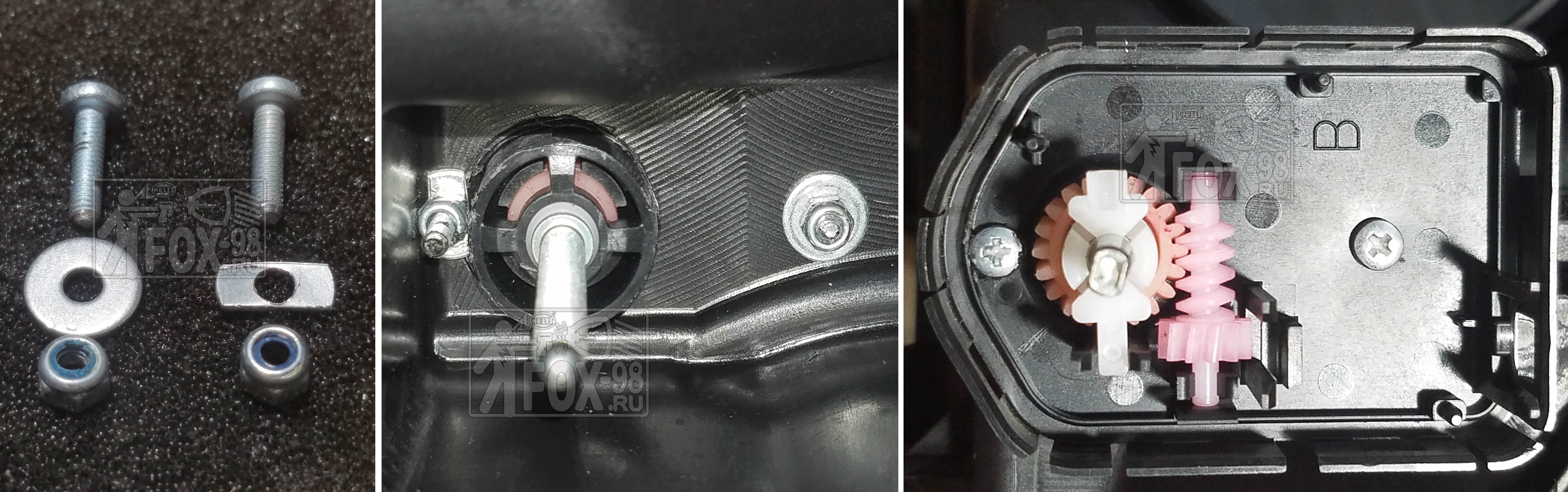 Так же существует и более радикальный способ (это когда внутри фары нет трёхзубой отливки). На пример этот способ можно применять для LEDфар которые пошли на Йолку после 2018г . В таком случае моторчики и фары полностью разбираются и (в дальнейшем несъёмным способом) соединяются на винты м3.