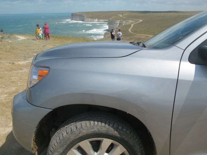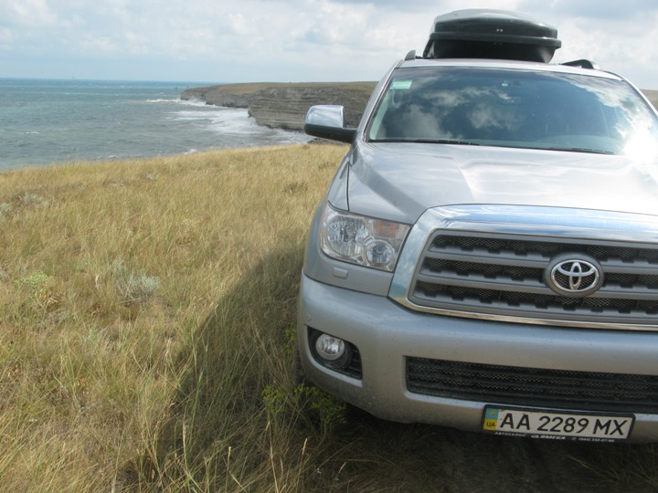 С учетом мокрого и каменистого грунта ехал все время на полном приводе, иногда, при крутом подъеме из балки, включал блокировку. Поэтому дорога была легкой и это позволило ехать по краю скалистого берега.
