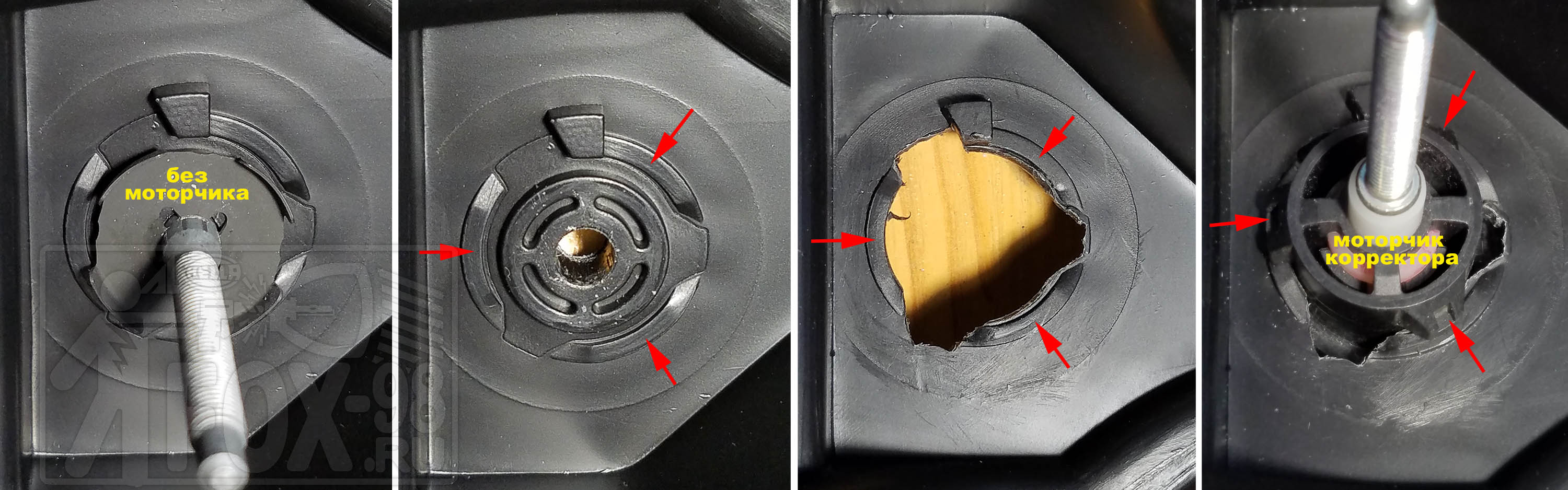 про болтики можно не вспоминать если внутри фары имеется имеется три отлива внутренней формовки (на них направлены стрелки) для зацепления лепестков моторчика. Эти отливы придают прочность и большую жесткость пластику в месте посадки моторчика. В случае если их вообще нет, то лучше прикручивать болтиками, чтоб на кочке не вырвало моторчик из корпуса фары.Yetti писал(а):Но ведь надо будет сам корректор болтиками прикручивать?