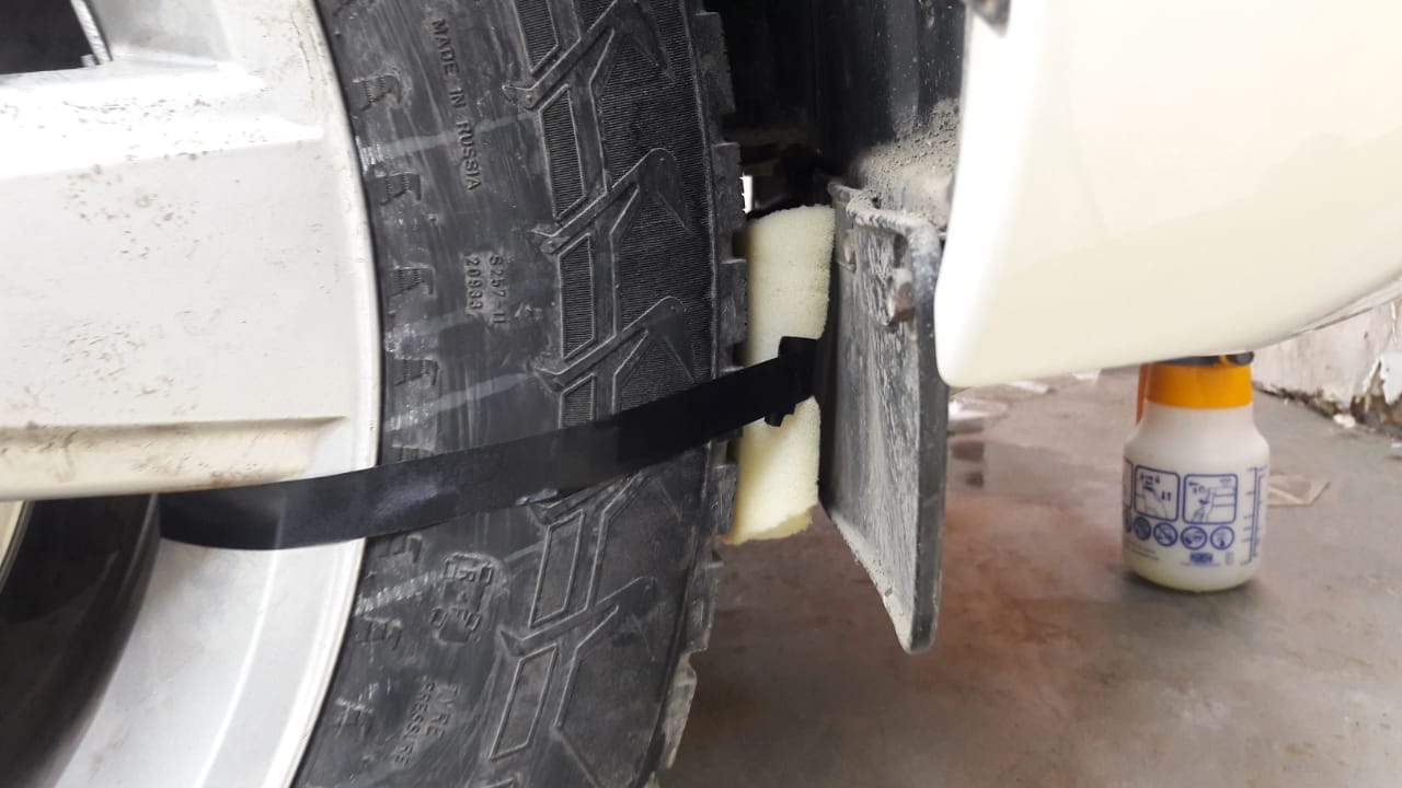 Одним словом, вся эта неопределенность побудила меня произвести некий эксперимент, пока моя машинка находилась в сервисе у ребят по оклейке бронь-пленкой кузова и бамперов, я использовал ненужный поролон, который нашел в ненужных обрезках у парней в сервисе. Итак, я нарезал его небольшими кусками размерами 3см х3см х 8см примерно. Далее нехитро прикрепил к переднему колесу в сборе с зимней шиной в стандартном размере эти кусочки поролона изолентой.