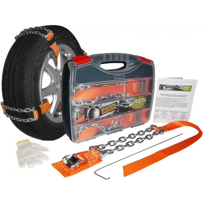 Браслеты противоскольжения Внедорожник – подходят для внедорожников и микроавтобусов, полной массой до 3300 кг. В комплекте 6 браслетов. Они подходят для размера шин: от 175/70 до 275/75, и радиуса: от R14 до R20. Браслеты противоскольжения для джипов имеют ширину ленты (полиэстер) - 35 мм и диаметр цепи - 6 мм. Полиэстеровые ленты имеют прочностные характеристики, сопоставимые со стальной лентой, и превосходят металл по эластичности, устойчивости к ударным нагрузкам и химическому воздействию. Браслеты необходимо одевать непосредственно перед преодолением сложного участка дороги, устанавливаются только на ведущую ось. К примеру, вы планируете поездку за город где обязательно будет болотистая местность. Весь путь пока качество дороги хорошее, можно спокойно преодолеть на своей резине. Когда же начинается бездорожье, одеваем браслеты, и продолжаем путь.